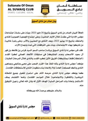 نادي السويق يعلن عدم المشاركة في مسابقات الإتحاد العماني لكرة القدم