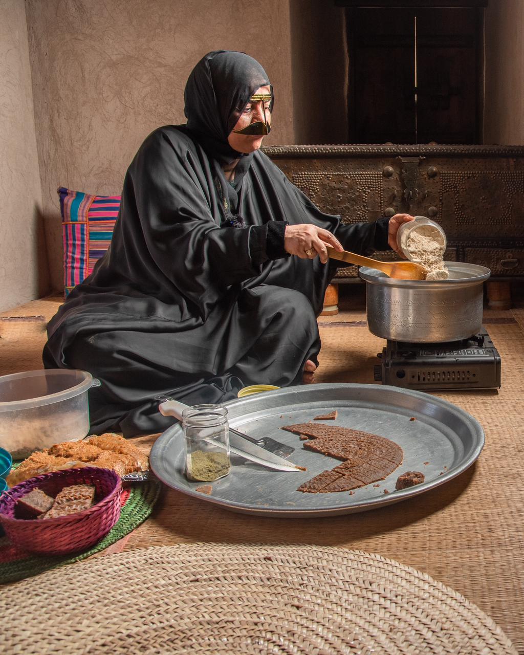 وقالت آمنة بنت سليمان الشحية من محافظة مسندم: إن عملية صنع الحلوى تبدأ باستخراج نواة التمر، ثم تدليكه وتليينه، وينخل الطحين جيدًا ثم يحمّر على نار هادئة، ثم يتم مزج التمر مع الطحين، بعدها يوضع السمن في القدر ثم تضاف إليه كل المكونات، وتخلط جميعها ثم توضع على النار حتى يستوي، ويوضع الخليط في صينية كبيرة أو مباشرة على الصرود، ويوضع صرود آخر فوقها حتى تنبسط جيدًا، ثم يتم تقطيعها على شكل مربعات صغيرة.