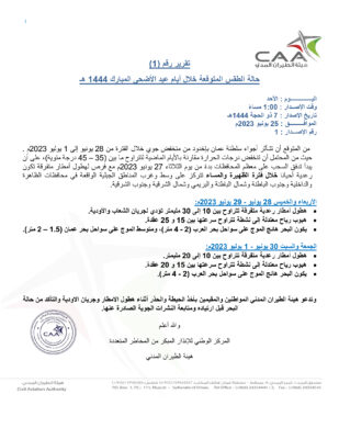 اصدرت هيئة الأرصاد الجوية عبر حسابها الرسمي على موقع التواصل الاجتماعي تويتر التقرير رقم (1) حول حالة الطقس المتوقعة خلال أيام عيد الأضحى المبارك.