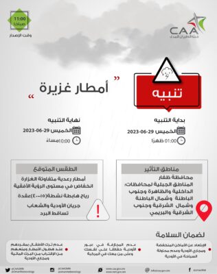 اصدرت هيئة الأرصاد الجوية عبر حسابها الرسمي على موقع التواصل الاجتماعي تويتر نبيهًا بغزارة الامطار على محافظة ظفار والمناطق الجبلية بجنوب الباطنة وشمال الباطنة وشمال الشرقية وجنوب الشرقية والبريمي و الداخلية والظاهرة .