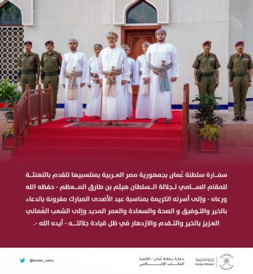 تقدمت سفارة سلطنة عمان بالقاهرة بالتهنئة للمقام السامي لحضرة صاحب الجلالة السلطان هيثم بن طارق المعظم حفظه الله ورعاه وإلى أسرته الكريمة بمناسبة ‎عيد الأضحى المبارك .
