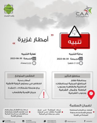 اصدرت الارصاد الجوية العمانية تنبيهاً بغزارة الأمطار المتوقعة والرياح الهابطة النشطة على أجزاء من محافظة ظفار والمناطق الجبلية من محافظات الداخلية والظاهرة وجنوب الباطنة وشمال الشرقية وجنوب الشرقية خلال فترة الظهيرة والمساء