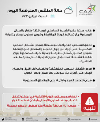 تدفق السحب العالية والمتوسطة وفرص تشكل السحب الركامية على أجزاء من جبال الحجر والمناطق المجاورة لها وفرص هطول أمطار متفرقة رعدية أحيانا مصحوبة برياح هابطة نشطة قد تؤدي لجريان الأودية خلال فترة ما بعد الظهيرة .