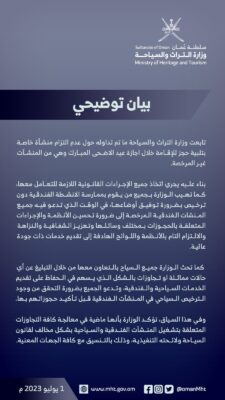 اعلنت وزارة التراث والسياحة عبر حسابها الرسمي على موقع التواصل الاجتماعي تويتر بيان توضيحي ، نصه “تابعت وزارة التراث والسياحة ما تم تداوله حول عدم التزام منشأة خاصة بتلبية حجز للإقامة خلال اجازة عيد الاضحى المبارك وهي من المنشآت غير المرخصة.