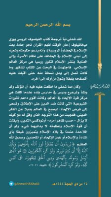 وأضاف الخليلي: كان مما شدني ما اطلعت عليه فيه أن المؤلف ولد ونشأ وترعرع ودرس في مدارس بلده عندما كانت هي مركز قوة الإلحاد في العالم، وكانت أقوى داعم للثورات الشيوعية التي كانت ضد الدين على الإطلاق، وتسعى إلى فرض الإلحاد؛ ليصبح في العالم بديلا عن الفكر الديني، فعجبت من هذا التوجه الذي وفق له مع كونه لا يزال – حسب ظاهر أمره – أرثوذكسي التدين، وأيقنت أن قوة الإسلام وعظمته لا يدانيهما شيء، ولو أن الملاحدة عندنا في بلاد الإسلام يتميزون غيظا بأي إشادة بالإسلام أو غمز للإلحاد أو الملحدين، وصدق الله العظيمِ ﴿ يُرِيدُونَ أَن يُطْفُواْ نُورَ اللَّهِ بِأَفْوَاهِهِمْ وَيَأْبَى اللَّهُ إِلَّا أَن يُتِمَّ نُورَهُ وَلَوْ كَرِهَ الْكَفِرُونَ * هُوَ الَّذِي أَرْسَلَ رَسُولَهُ بِالْهُدَى وَدِينِ الْحَقِّ لِيُظْهِرَهُ عَلَى الدِّينِ كُلِهِ وَلَوْ كَرِهَ الْمُشْرِكُونَ ﴾ التوبة، ٣٢ – ٠٣٣