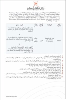 تعلن وزارة الطاقة والمعادن وبالتنسيق مع وزارة العمل عن توفر وظيفة مدير عام المديرية العامة للمعادن للعمانيين، فعلى من يجد في نفسه الكفاءة والرغبة لشغل الوظيفة المبينة أدناه أن يتقدم بطلبه إلى مبنى ديوان عام وزارة الطاقة والمعادن وذلك بدءا من يوم (الثلاثاء) الموافق 2023/7/4م وحتى نهاية الدوام الرسمي يوم (الثلاثاء) الموافق 18 / 2023/7م، ولن ينظر في أي طلب بعد انقضاء فترة التسجيل على أن يكون المتقدم للوظيفة بالإضافة إلى شروط شغلها مستوفيا للشروط كما هو موضح ادناه :