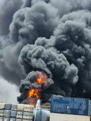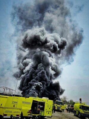 الحريق هائل بسبب نشوبه في مواد بترولية سريعة الإشتعال . في أحدى المصانع