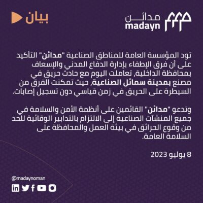 وتدعو “مدائن” القائمين على أنظمة الأمن والسلامة في جميع المنشآت الصناعية إلى الالتزام بالتدابير الوقائية للحد من وقوع الحرائق في بيئة العمل والمحافظة على السلامة العامة.