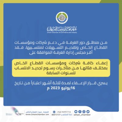 اكدت غرفة تجارة وصناعة عمان عبر حسابها الرسمي على موقع التواصل الاجتماعي تويتر ، انه من منطلق دور الغرفة في دعم شركات ومؤسسات القطاع الخاص وتقديم التسهيلات لمنتسبيها، فقد أقر مجلس إدارة الغرفة الموافقة على إعفاء كافة شركات ومؤسسات القطاع الخاص بمختلف فئاتها من متأخرات رسوم تجديد الانتساب للسنوات السابقة.