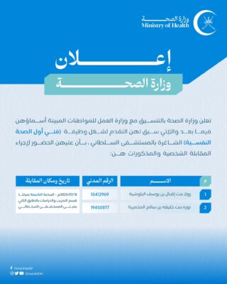 تعلن وزارة الصحة وبالشراكة مع وزارة العمل عن أسماء المواطنات المرشحات لحضور المقابلات الشخصية لشغل وظيفة فني أول الصحة النفسية.