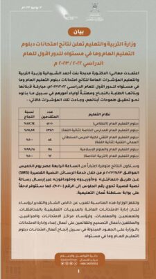 اعتمدت وزارة التربية والتعليم المؤشرات العامة لنتائج امتحانات دبلوم التعليم العام وما في مستواه للدور الأول للعام الدراسي 2022/2023م حيث بلغت نسبة النجاح 82,64 بالمائة.