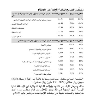 1) بلغ صافـي إيـرادات الفـوائد من الأعمال المصرفية التقليدية وإيرادات التمويل الإسلامي (184.71) مليون ريال عماني للستة أشهر المنتهيةفي 30 يونيو 2023م مقارنة بمبلغ (166.25) مليون ريال عماني للفترة ذاتها من العام 2022م، أي بزيادة نسبتها (%11.1).