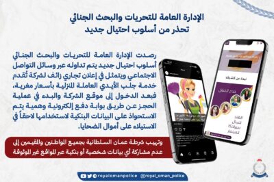 أعلنت شرطة عمان السلطانية عبر حسابها الرسمي على موقع التواصل الاجتماعي تويتر ، ان الإدارة العامة للتحريات والبحث الجنائي تحذر من أسلوب احتيال جديد، حيث رصدت الإدارة ان الاسلوب الجديد يتم تداوله عبر وسائل التواصل الاجتماعي ويتمثل في إعلان تجاري زائف الشركة تقدم خدمة جلب الأيدي العاملة المنزلية بأسعار مغرية، فبعد الدخول إلى موقع الشركة والبدء في عملية الحجز عن طريق بوابة دفع إلكترونية وهمية يتم الاستحواذ على البيانات البنكية لاستخدامها لاحقاً في الاستيلاء على أموال الضحايا.