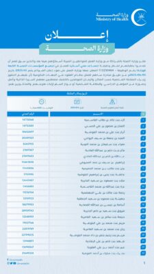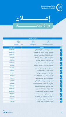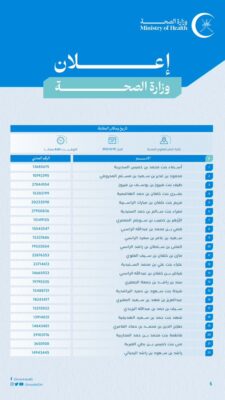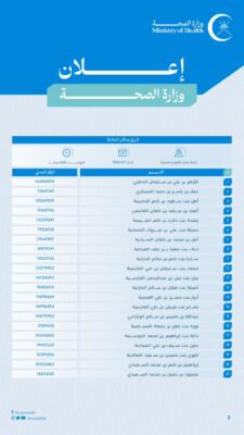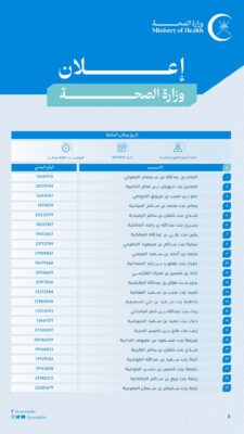 تعلن وزارة الصحة بالشراكة مع وزارة العمل للمواطنين المبينة أسماؤهم فيما بعد واللذين سبق لهم أن تقدموا بطلباتهم لشغل وظيفة مساعد صحي (أسنان للعمل في جميع المؤسسات الصحية التابعة للوزارة) رقم الوظيفة – 113230464 المعلن عنها بوزارة العمل على ضوء إعلان الشواغر رقم (2023/4) بتاريخ 2023/06/05م عن طريق مبادرة ساهم للعمل بنظام العقود في الجهات الحكومية بأن عليهم الحضور لإجراء المقابلة الشخصية حسب المكان والزمان الموضحين بالكشف مصطحبين معهم السيرة الذاتية وأصل وصورة من المؤهل الدراسي والبطاقة الشخصية أو جواز السفر لإثبات هويتهم والمذكورين هم:
