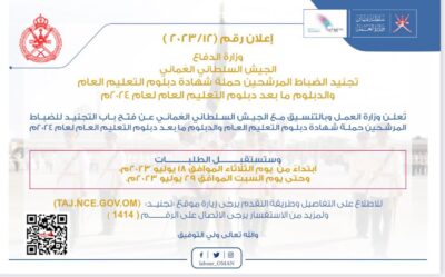 تُعلن وزارة العمل بالتنسيق مع الجيش السلطاني العُماني عن فتح باب التجنيد للضباط المرشحين حملة شهادة دبلوم التعليم العام ودبلوم ما بعد دبلوم التعليم العام لعام 2024 وسيتم استقبال الطلبات عبر موقع تجنيد ابتداءً من 18وحتى 29 يوليو2023