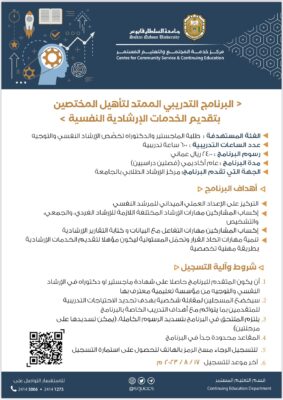 ‏⁧‫تعلن جامعة السلطان قابوس‬⁩ عن تقديم البرنامج التدريبي المُمتدّ لتأهيل المختصين بتقديم الخدمات الإرشادية النفسية