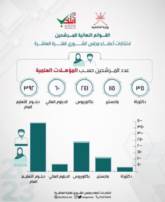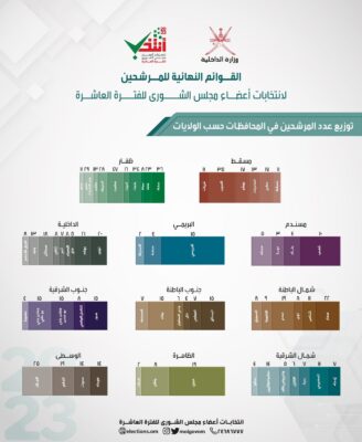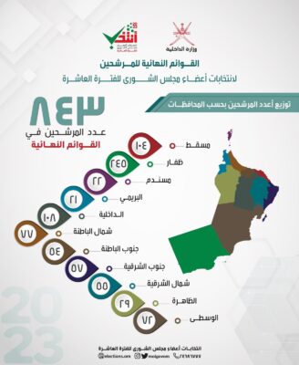 اعلنت وزارة الداخلية ان 843 مرشحًا بينهم 32 امرأة في القوائم النهائية التي أعلنت عنها وزارة الداخلية للمرشحين لعضوية مجلس الشورى للفترة العاشرة، وذلك عبر تطبيق “انتخاب” والموقع الإلكتروني للانتخابات (elections.om).