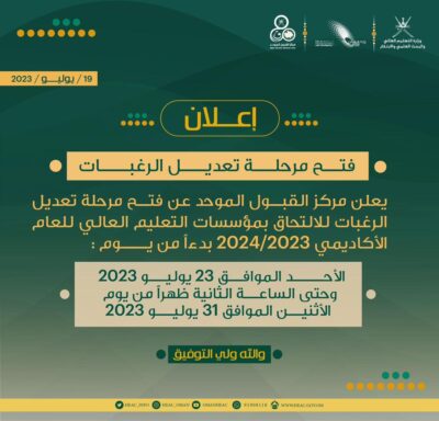 اعلن مركز القبول الموحد عبر موقع التواصل الاجتماعي تويتر عن فتح مرحلة تعديل الرغبات للالتحاق بمؤسسات التعليم العالي للعام الأكاديمي 2024/2023 بدءاً من يوم : الأحد الموافق 23 يوليو 2023 وحتى الساعة الثانية ظهراً من يوم الأثنين الموافق 31 يوليو 2023