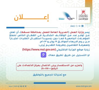 تُعلن وزارة العمل ممثلة بالمديرية العامة للعمل بمحافظة مسقط عن توفر عدد من الوظائف الشاغرة في مؤسسات القطاع الخاص لحملة المؤهلات الجامعية فما دون، وسيبدأ استقبال الطلبات اعتبارًا من اليوم الأربعاء الموافق 19 يوليو 2023م