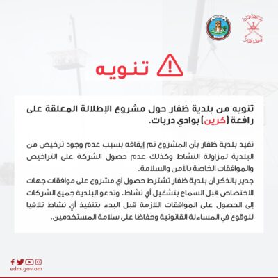 أفادت بلدية ظفار أن مشروع الاطلالة المعلقة بوادي دربات توقف بسبب عدم وجود ترخيص من البلدية لمزاولة النشاط ، وكذلك عدم حصول الشركة على التراخيص والموافقات الخاصة بالأمن والسلامة. جدير بالذكر أن بلدية ظفار تشترط حصول أي مشروع على موافقات الجهات المختصة قبل السماح بتشغيل أي نشاط ، وتدعو البلدية جميع الشركات للحصول على الموافقات اللازمة قبل البدء في تنفيذ أي نشاط لتجنب المساءلة القانونية. وللحفاظ على سلامة المستخدمين.