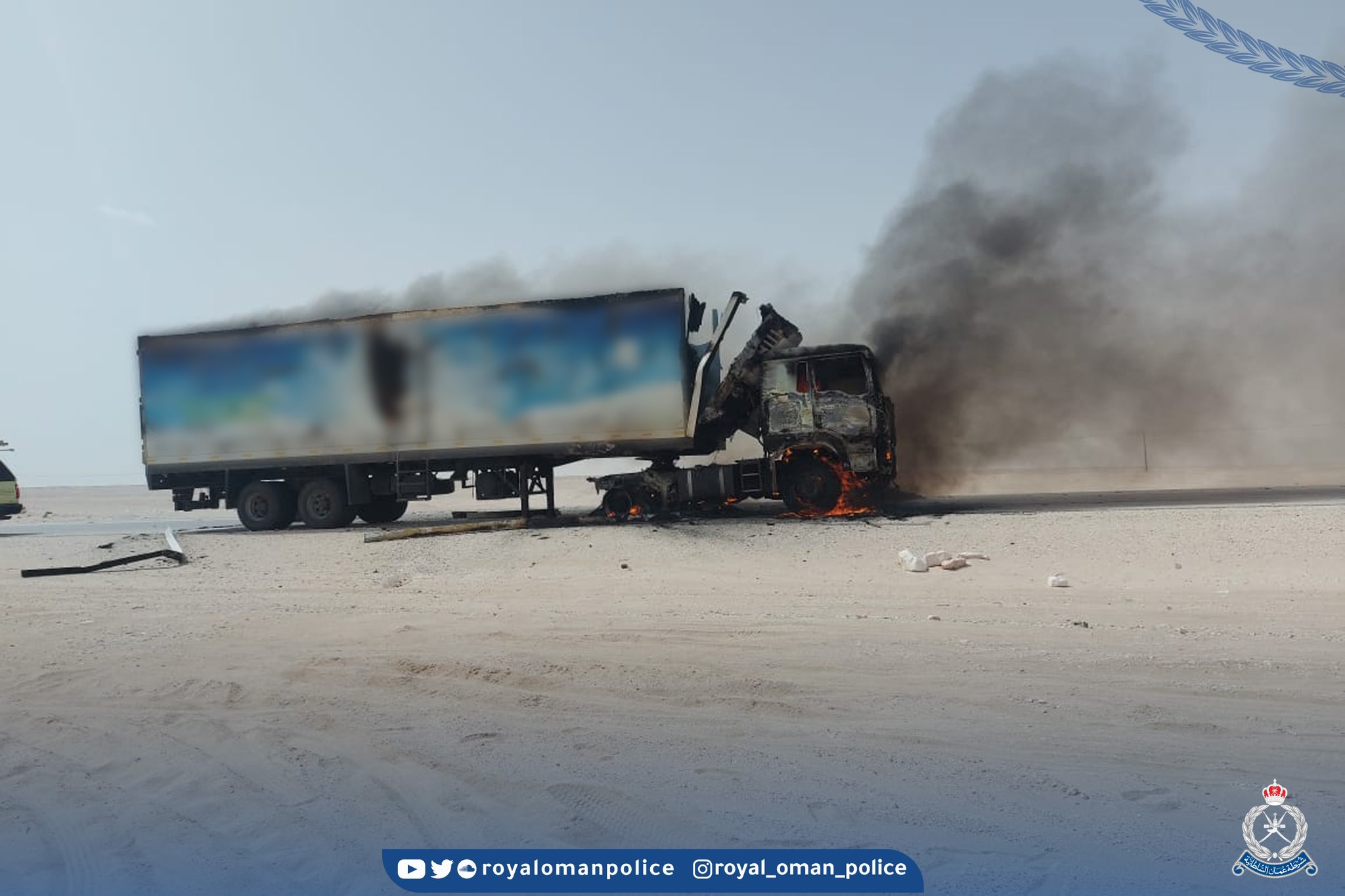 لمستخدمي طريق “أدم – ثمريت” الأنتباه ..نشوب حريق في شاحنة