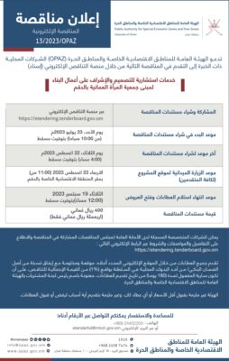 اعلنت هيئة المناطق الاقتصادية الخاصة والمناطق الحرة للشركات المحلية ذات الخبرة المشاركة في مناقصة الخدمات الاستشارية للتصميم والإشراف على أعمال البناء لمبنى جمعية المرأة العمانية‬⁩ بالدقم‬⁩ وذلك من خلال منصة التناقص الإلكتروني ⁧‫إسناد‬⁩ :