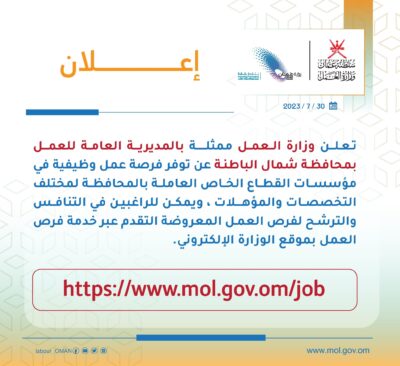 تعلن ⁧‫وزارة العمل‬⁩ ممثلة بالمديرية العامة للعمل بمحافظة شمال الباطنة عن توفر فرصة عمل وظيفية في مؤسسات القطاع الخاص العاملة بالمحافظة لمختلف التخصصات والمؤهلات ، للاطلاع والتسجيل لفرص العمل المعروضة التقدم عبر خدمة فرص العمل :