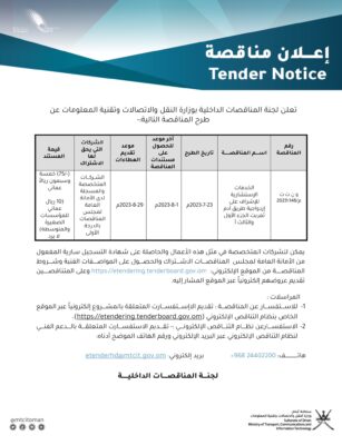 اعلنت وزارة النقل والاتصالات و تقنية المعلومات عن طرح مناقصة الخدمات الإستشارية للإشراف على ازدواجية طريق أدم ثمريت الجزء الأول والثالث أ . التفاصيل ادناه :