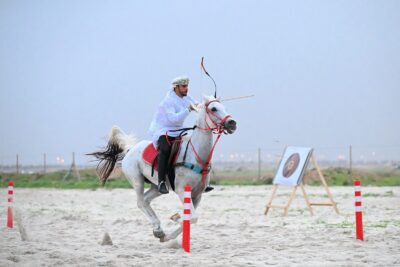 كما تخلل بطولة التقاط الاوتاد استعراض لمهارة الرماية بالقوس من على ظهر الخيل نفذها عدد من الفرسان الممارسين لهذه الرياضة الجميلة والتي بدأت في الانتشار خلال السنوات الماضية بدول الخليج كدولة قطر وسلطنة عمان وغيرها، حيث استمتع الحضور بالاستعراض الذي قدمه فرسان هذه المهارة.