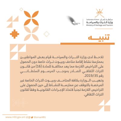 تهيب وزارة التراث والسياحة بكافة المتاحف وبيوت التراث الخاصة غير المرخصة بالتوقف عن ممارسة النشاط إلى حين الحصول على التراخيص اللازمة تجنباً لاتخاذ الإجراءات القانونية وفقاً لقانون التراث الثقافي.