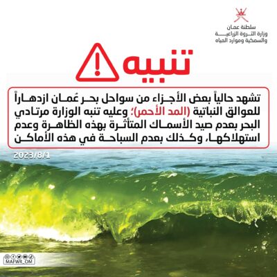 نبهت وزارة الثروة الزراعية والسمكية وموارد المياه حول تأثر بعض أجزاء سواحل بحر عمان بالعوالق النباتية (المد الأحمر) ،ولذلك يجب على مرتادي البحر عدم صيد الأسماك المتأثرة بهذه الظاهرة ، وكذلك عدم السباحة في هذه الأماكن .