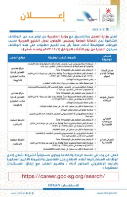 أعلنت وزارة العمل وبالتنسيق مع وزارة الخارجية عن توفر عدد من الوظائف الشاغرة لدى الأمانة العامة لمجلس التعاون لدول الخليج العربية حسب البيانات الموضحة أدناه، علما بأن بدء تقديم الطلبات على هذه الوظائف سيكون اعتبارا من يوم الثلاثاء الموافق (01/08/2023م ولمدة شهر).