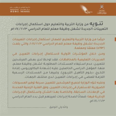 وأضافت: “ننوه لجميع المرشحين للتعيين سرعة توفير المسوغات الضرورية للاستمرار في إجراءات التعيين وفق الفترة الزمنية المحددة في الإعلانات السابقة، والخاصة بهذا الشأن واستكمال الإجراءات الإدارية فيها ضماناً لصحة إجراءات تعيينهم قبل بدء العام الدراسي الجديد”.