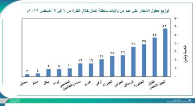 احتلت ولاية الجبل الاخضر المرتبة الاولى بـ 58 ملم فيما جاءت ولاية سمائل في المرتبة الاخيرة 3 ملم . اما ولايتي عبري ودماء متساويتان بـ16 ملم .