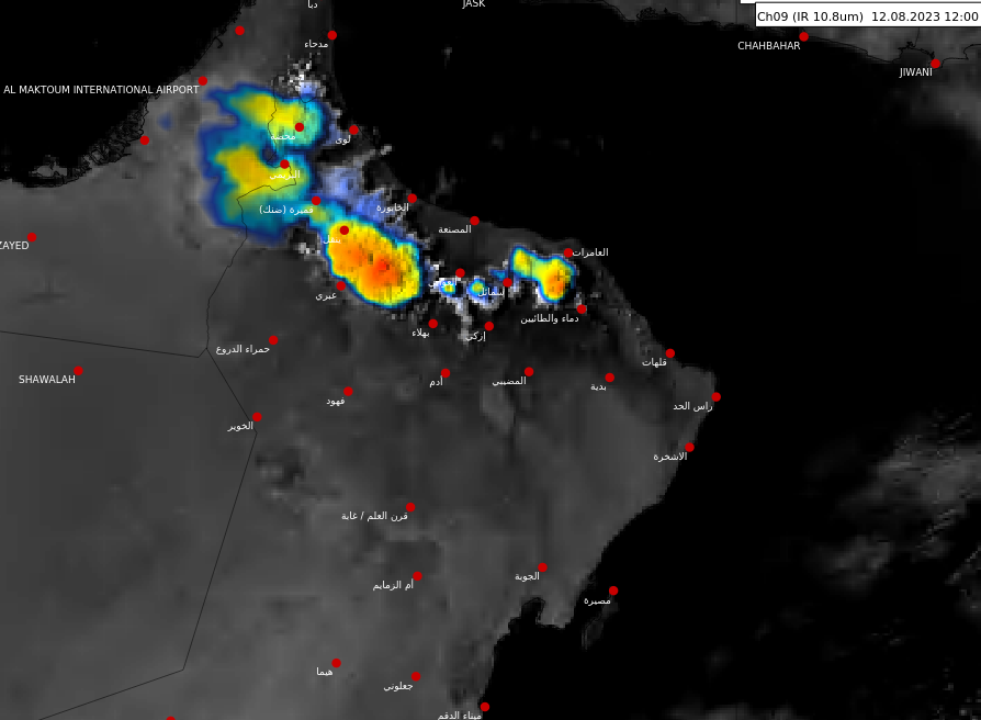 نشرت هيئة الأرصاد الجوية عبر حسابها الرسمي على موقع التواصل الاجتماعي اكس اخر الصور الجوية تظهر استمرار نشاط التكونات المحلية على المناطق الجبلية من محافظات ( البريمي والظاهرة وشمال وجنوب الباطنة والداخلية ومسقط )