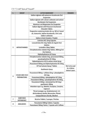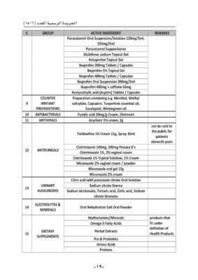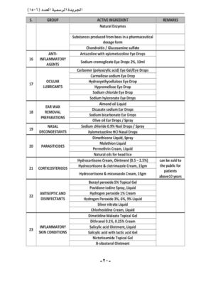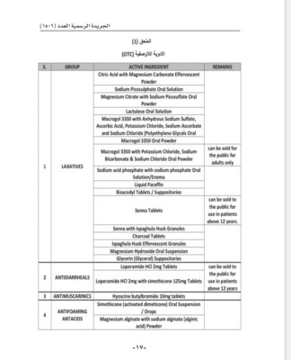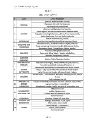 يجوز للصيدليات – دون غيرها – صرف الأدوية اللاوصفية (OTC) المبينة في الملحق (۱) المرفق بهذا القرار دون وصفة طبية. كما يجوز للمحال التجارية بيع الأدوية اللاوصفية (GSL) المبينة في الملحق (۲) المرفق بهذا القرار.