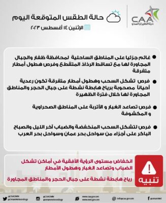 انخفاض مستوى الرؤية الأفقية في أماكن تشكل الضباب وتصاعد الغبار وهطول الأمطار،رياح هابطة نشطة على جبال الحجر والمناطق المجاورة.