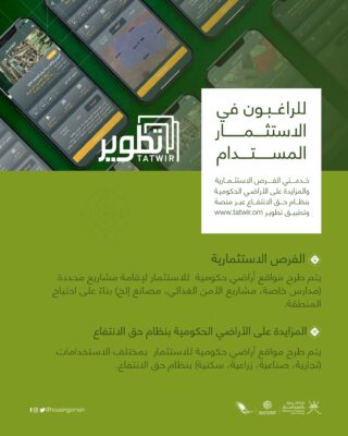 للراغبين في الاستثمــار المستدام خدمتي الفرص الاستثمارية والمزايدة على الأراضي الحكومية بنظام حق الانتفاع عبر منصة وتطبيق تطوير www.tatwir.om .