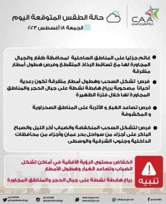 أعلنت هيئة الأرصاد الجوية عبر حسابها الرسمي على موقع التواصل الاجتماعي “اكس” عن حالة الطقس المتوقعة اليوم الجمعة ١٨ أغسطس ٢٠٢٣.