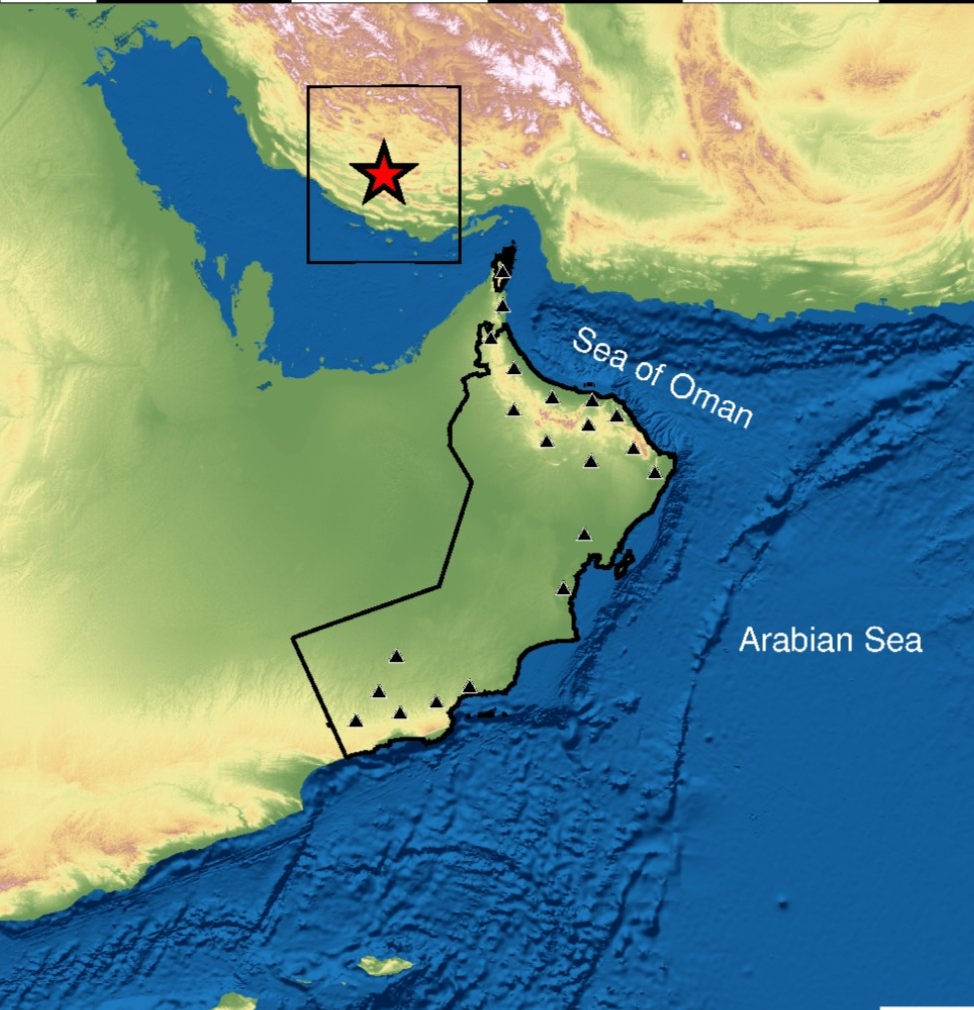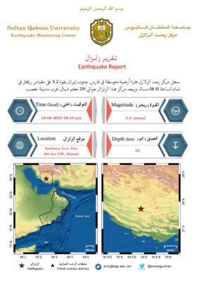 سجل مرکز رصد الزلازل التابع لجامعة السلطان قابوس هزة أرضية متوسطة في فارس جنوب إيران بقوة 5.2 على مقياس ريختر في تمام الساعة 08:10 مساءً.