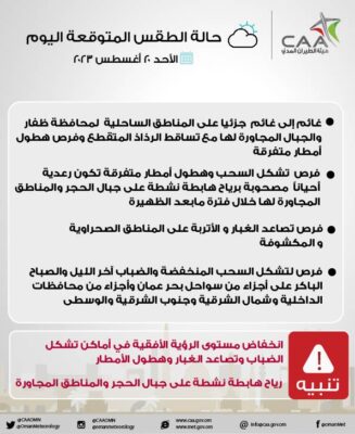 اعلنت هيئة الأرصاد الجوية عبر حسابها الرسمي على موقع التواصل الاجتماعي تويتر عن حالة الطقس المتوقعة اليوم الأحد ٢٠ أغسطس ٢٠٢٣.
