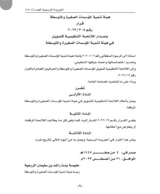 استنادا إلى المرسوم السلطاني رقم ۲۰۲٠/١٠٧ بإنشاء هيئة تنمية المؤسسات الصغيرة والمتوسطةوتحديد اختصاصاتها واعتماد هيكلها التنظيمي وإلى اللائحة التنظيمية لتمويل المؤسسات الصغيرة والمتوسطة والحرفيين الصادرة بالقرار رقم ٢٠٢٢/١٩ وبناء على ما تقتضيه المصلحة العامة.