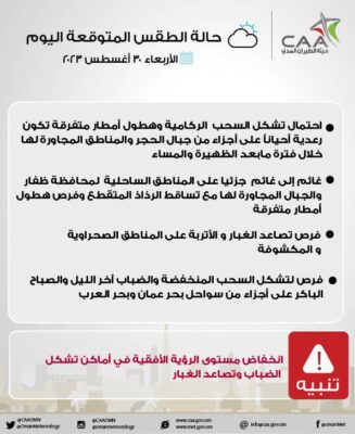 أعلنت هيئة الأرصاد الجوية عبر حسابها الرسمي على موقع التواصل الاجتماعي أكس عن حالة الطقس المتوقعة اليوم ، حيث تدفق السحب العالية والمتوسطة على عموم محافظات سلطنة عمان.