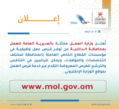 تُعلن وزارة العمل ممثلة بالمديرية العامة للعمل في محافظة الداخلية عن توفر فرص عمل وظيفية في مؤسسات القطاع الخاص العاملة بالمحافظة، ويمكن للراغبين في التنافس عل الفرص المعروضة التقدم عبر خدمة فرص العمل بموقع الوزارة الإلكتروني.