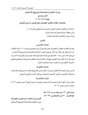 يحدد العائد مقابل الحصول على قرض أو دين تجاري بنسبة (٦) ستة بالمائة ما لم يتفق على أقل من ذلك، ويجوز لوزير التجارة والصناعة وترويج الاستثمار – في كل حالة على حدة – الاتفاق مع غرفة تجارة وصناعة عمان على تجاوز هذه النسبة في حال ما إذا كانت مدة القرض طويلة، أو كان غرضه متعلقا بمشروعات تسهم في تحقيق التنمية الاقتصادية، أو كانت درجة المخاطرة عالية.