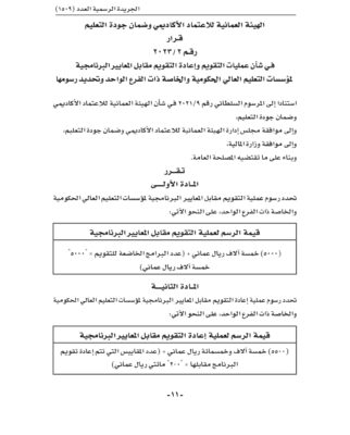 اصدرت الهيئة العمانية للاعتماد الأكاديمي وضمان جودة التعليم قرار في شأن عمليات التقويم وإعادة التقويم مقابل المعايير البرنامجية المؤسسات التعليم العالي الحكومية والخاصة ذات الفرع الواحد وتحديد رسومها رقم ٢٠٢٣/٢.