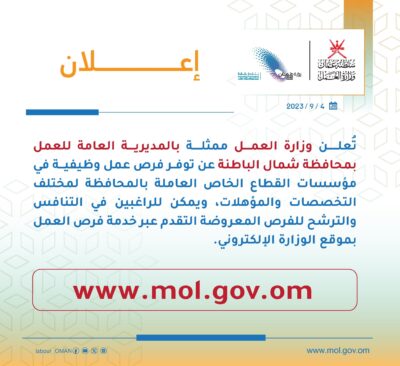 اعلنت وزارةالعمل ممثلة بالمديرية العامة للعمل بمحافظة شمال الباطنة توفر فرصة عمل وظيفية في مؤسسات القطاع الخاص العاملة بالمحافظة لمختلف التخصصات والمؤهلات ، للاطلاع والتسجيل في فرص العمل المعروضة يُرجى التقدم عبر خدمة فرص العمل.