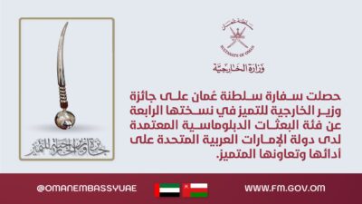 حصلت سفارة سلطنة عُمان بأبوظبي على جائزة وزير الخارجية للتميز في نسختها الرابعة عن فئة البعثات الدبلوماسية المعتمدة لدى دولة الامارات العربية المتحدة على أدائها وتعاونها المتميز.