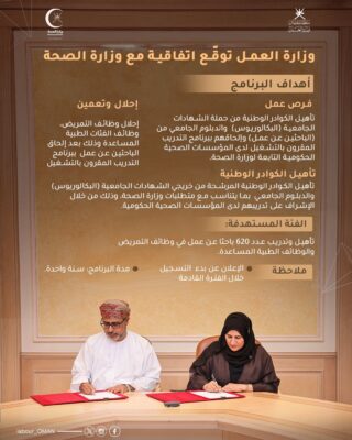 وهج الخليج - مسقط وقعت وزارة العمل برنامج تعاون مع وزارة الصحة في مجال التدريب المقرون بالتشغيل لتأهيل وتدريب عدد 620 باحثا عن عمل في وظائف التمريض والوظائف الطبية المساعدة.