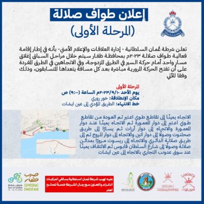 تعلن شرطة عُمان السلطانية – إدارة العلاقات والإعلام الأمني- بأنه في إطار إقامة فعالية طواف صلالة ۲۰۲۳م بمحافظة ظفار سيتم خلال مراحل السباق إغلاق مسار واحد أمام حركة السير في الطرق المزدوجة، وفي الاتجاهين في الطرق المفردة على أن تفتح الحركة المرورية مباشرة بعد كل مسافة يتعداها المتسابقون، وذلك وفقا للآتي